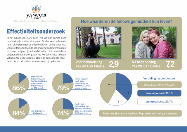 De behandeling van Yes We Can Clinics is voor het overgrote deel van de jongeren effectief. 74% van de fellows heeft na Yes We Can geen specialistische ggz meer nodig. Dat blijkt uit onderzoek van Quelsa onder jongeren die in 2016, 2017, 2018 én 2019 bij Yes We Can Clinics behandeld zijn. Het onderzoek door bureau Quelsa is gehouden in juni en juli 2020. Hieronder een factsheet met de belangrijkste resultaten uit het onderzoek.